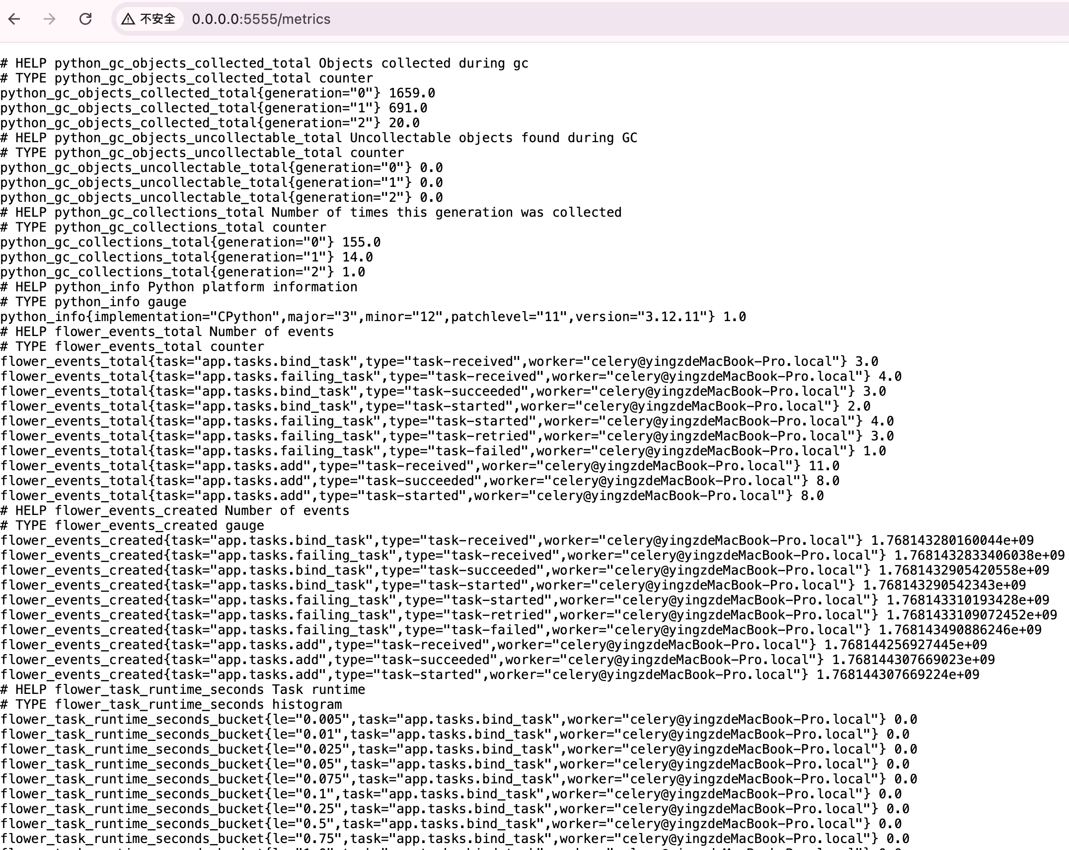 这块不得不说 Prometheus 协议的强大之处,flower 同时启动了 http://0.0.0.0:5555/metrics 地址提供了符合 Prometheus 抓取格式的数据,因此就可以天然对接 Prometheus 了: